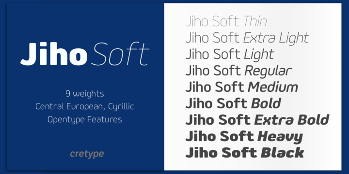 Jiho Soft is versatile type family of 18 fonts. Jiho Soft family consists of 9 weights (Thin, ExtraLight, Light, Regular, Medium, Bold, ExtraBold, Heavy & Black) with their corresponding italics.